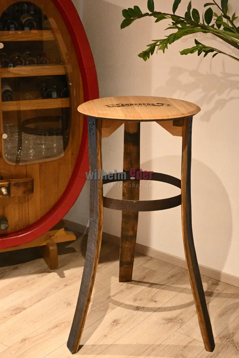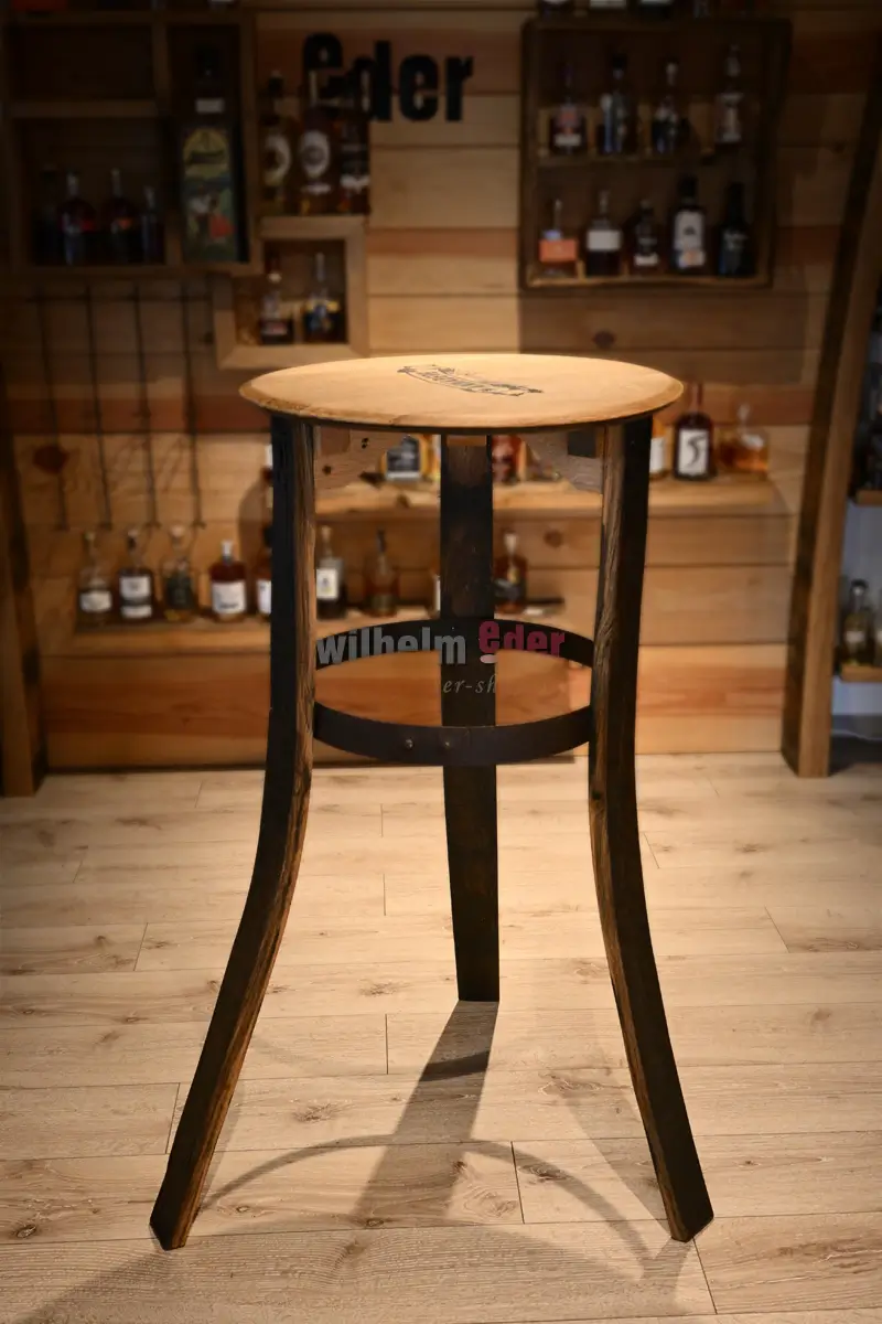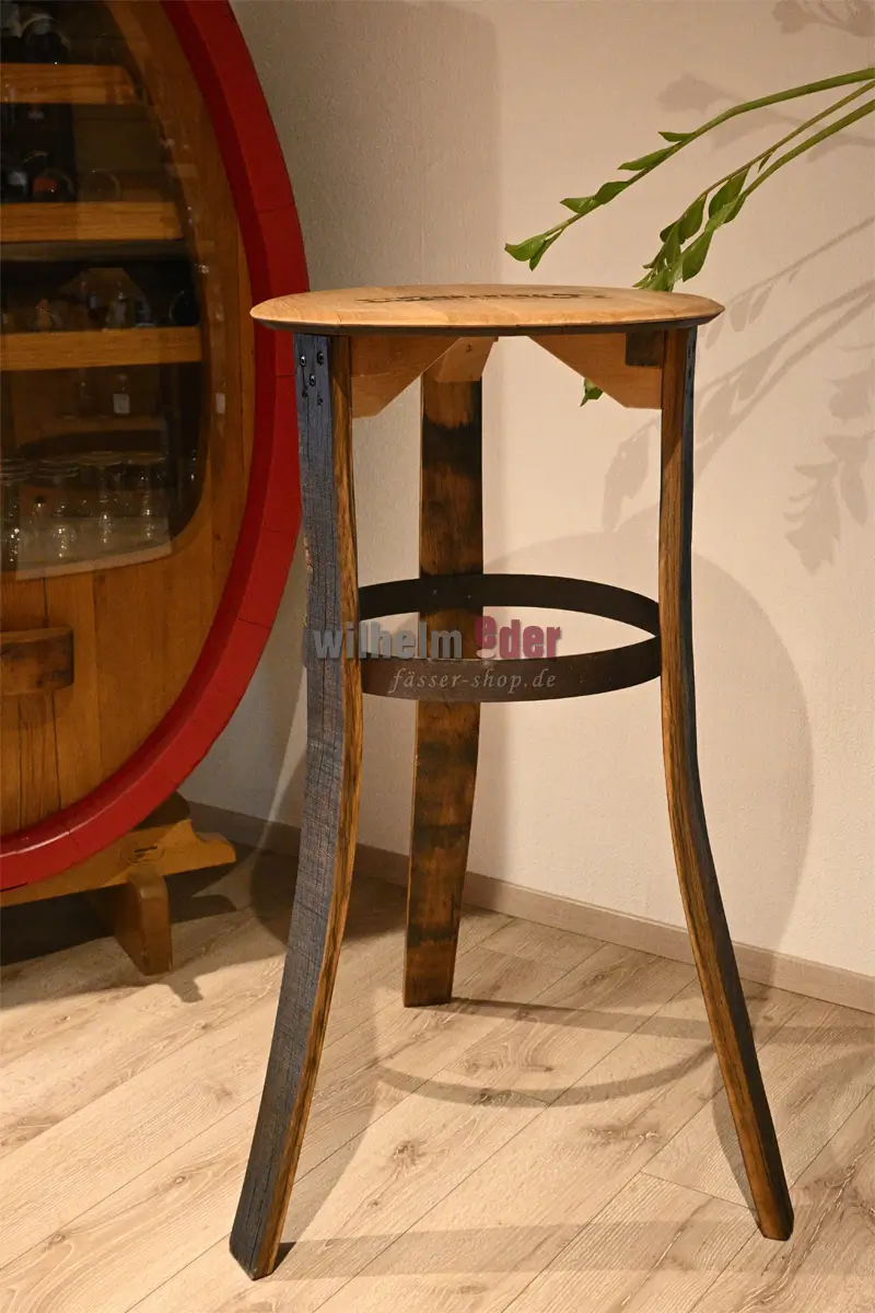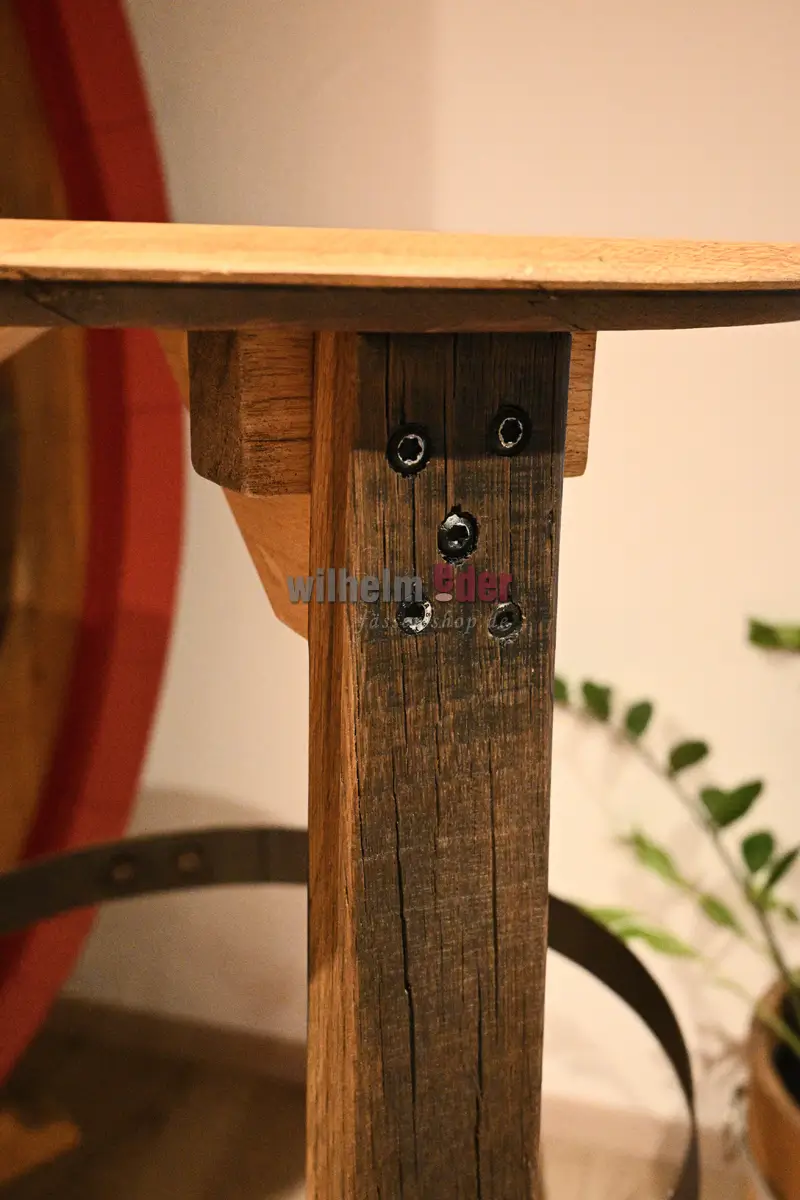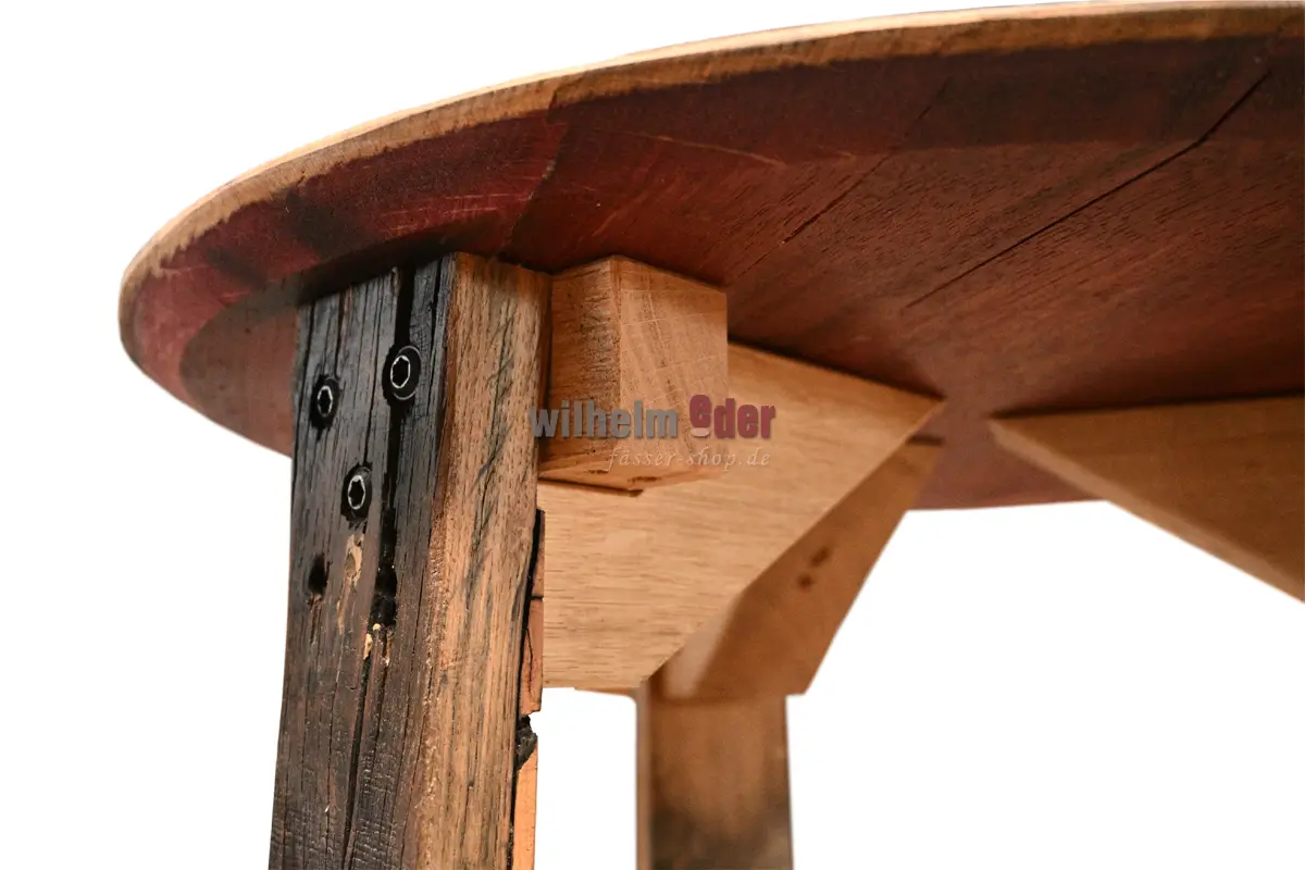 Die runde Tischplatte besteht aus sorgfältig gesäuberten, getrockneten und verleimten Eichenholzdauben – auf Wunsch mit einem individuellen Laserbranding (z. B. Firmenlogo oder Wappen). Sie ruht auf drei formschön gebogenen Fassdauben, die einst Teil großer Weinfässer waren und nun in neuem Glanz erstrahlen.