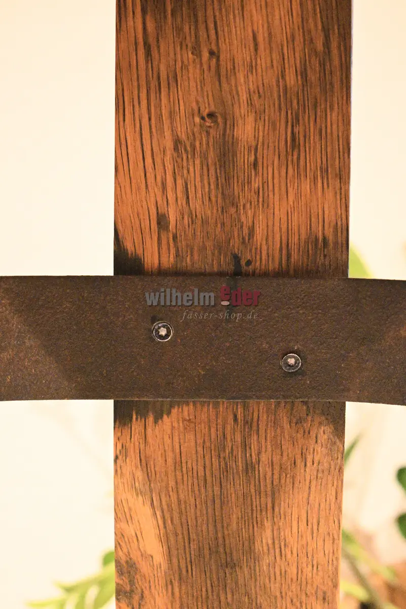 Ein gebrauchter Fassreifen in der Mitte hält die Dauben stabil zusammen und unterstreicht den charakteristischen Look dieses einzigartigen Möbelstücks.