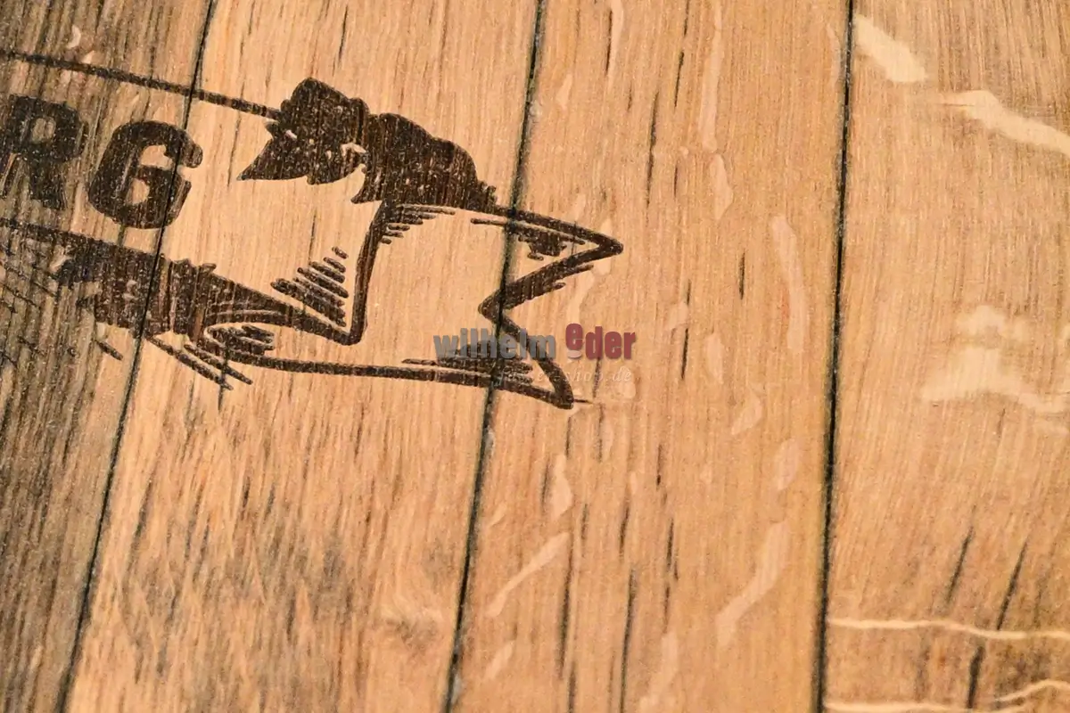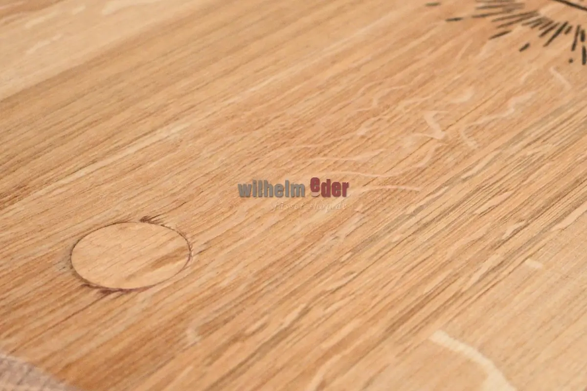 - Tischplatte aus verleimtem Eichenholz (Barrique-Fassdeckel), optional mit Laserbranding (nicht inkl.)