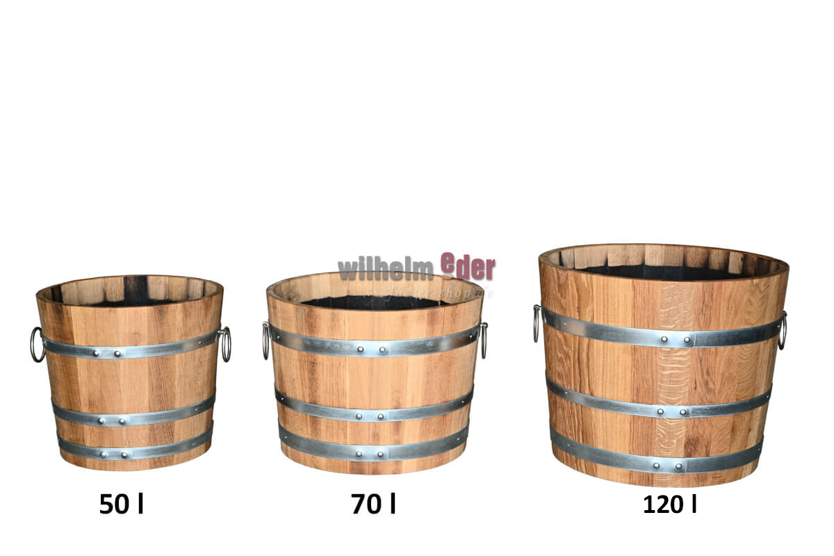 Dekorative Pflanzkübel 50 l – 120 l für den Außenbereich – ein Blickfang für Ihren Garten, Wintergarten oder Ihre Terrasse. Die originellen Gefäße sind ebenfalls in Orangerien, Parks und auf sonstigen schönen Plätzen zu finden. Die robusten Bottiche sind aus abgelagertem Eichenholz, sogenannten Dauben, hergestellt. Dieses Eichenholz stammt aus dem Pfälzer Wald und aus nachhaltig bewirtschafteten Wäldern. Die Dauben werden nach Küfertradition abgerichtet, zu einem Bottich verarbeitet und zusätzlich verleimt. Die Kübel sind innen vollflächig ausgefeuert. Dies dient als zusätzlicher Fäulnisschutz. Außen verleiht die Behandlung mit Leinöl einen seidig matten Glanz. Die langlebigen Blumen-, Baum-, oder Kräutergefäße sind mit verzinkten Reifen abgebunden und seitlich mit zwei runden Griffen aus Edelstahl versehen. Bei Bepflanzung der Kübel raten wir dringend, Löcher zum Wasserablauf in den Boden des Kübels zu bohren. Am Ende der Bestellung besteht die Möglichkeit, uns diesen Wunsch im Kommentarfeld mitzuteilen - dieser Service ist für Sie kostenlos!