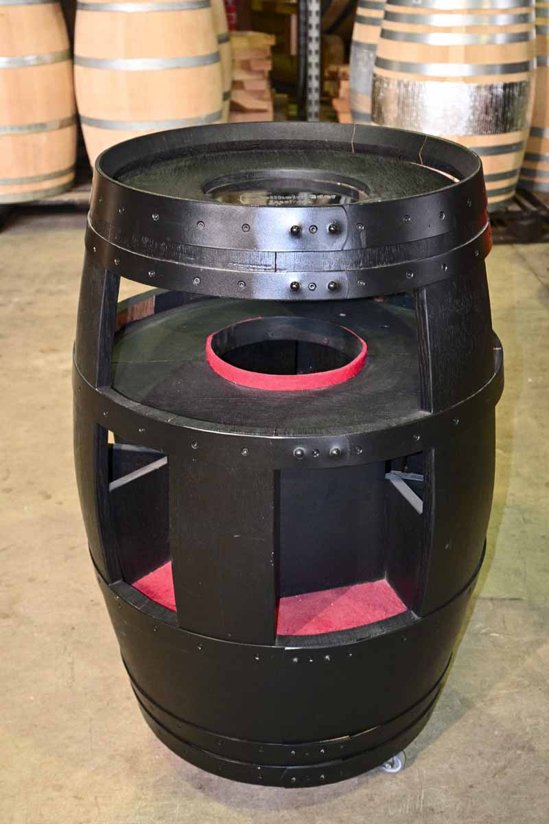 Die unteren seitlichen Öffnungen, die rund um das Fass gehen, sind mit rotem Filz ausgelegt. Hier finden Ihre Lieblingsflaschen Platz wogegen die breiteren Öffnungen darüber Ablagefläche für Ihre Fachliteratur oder andere Lieblingsstücke bieten.