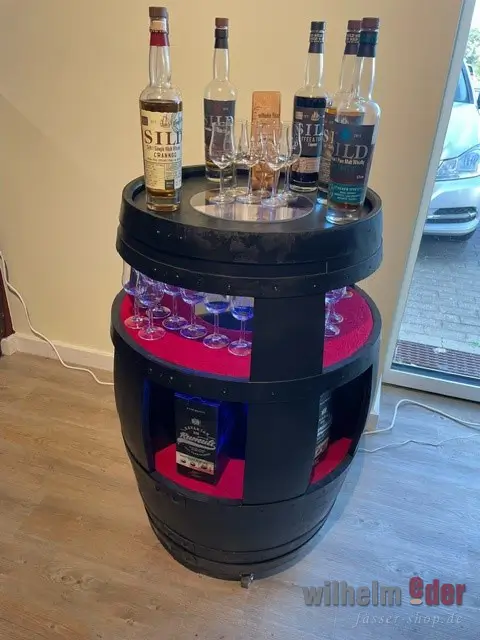 Exklusive Spirituosenbar, hergestellt aus einem gebrauchtem 225 l Weinfass, welches in aufwendiger Handwerksarbeit in dieses tolle Display umgebaut wurde.