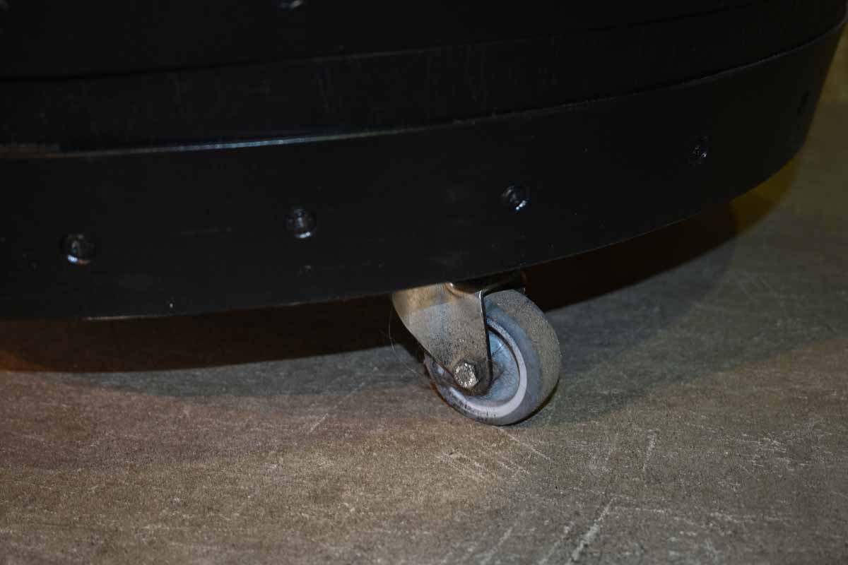 Vier Rollen, eine davon mit Feststellbremse, sorgen für die Mobilität des Fasses. Die Bar ist schwarz lackiert.