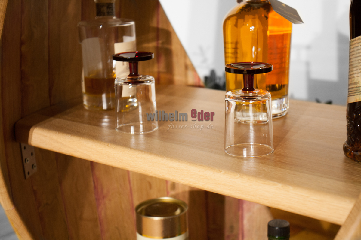 Original Bourbonfass aus den USA oder aus einer Single Malt Belegung aus Schottland. Das Fass ist vorne geöffnet und mit einem original Whiskydeckel innen als Regal gearbeitet. Die Reifen wurden professionell verschraubt und gegen das Herabfallen gesichert. Das Fass ist mit einer abschließbaren Tür mit Plexiglasplatte ausgestattet. Wir legen bei diesem Produkt Wert auf größtmögliche Authentizität. Dies bedeutet, dass ein Regalfass/Tisch dieser Art zuvor jahrelang in den „Warehouses“ der unterschiedlichen Destillen gelegen hat und bewegt wurde. Kerben im Holz oder unter Umständen ein unebener Boden sind keine Qualitätsmängel sondern vielmehr durch die Eigenart der Bauweise und die Vorbenutzung der Fässer bestimmt. Vor der Herstellung von Regalen lassen wir die Fässer trocknen und verleimen die Dauben einzeln. Dieser aufwendige Prozess gewährleistet die Stabilität des Regals und verhindert, dass das Holz sich aufgrund Temperaturschwankungen verzieht. Bitte beachten Sie trotzdem, dass allzu trockene und warme Heizungsluft dem Fass nicht guttut. Die LED Beleuchtung kann als Option unter Zubehör bestellt werden.