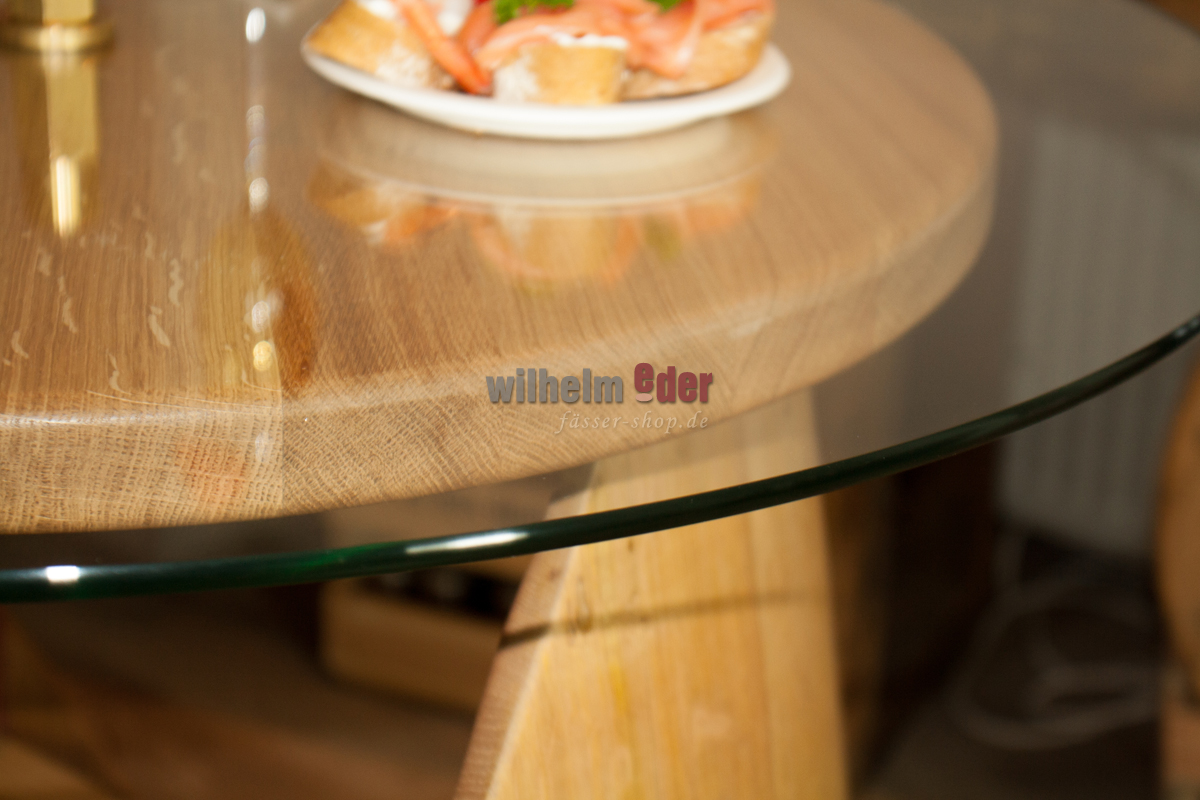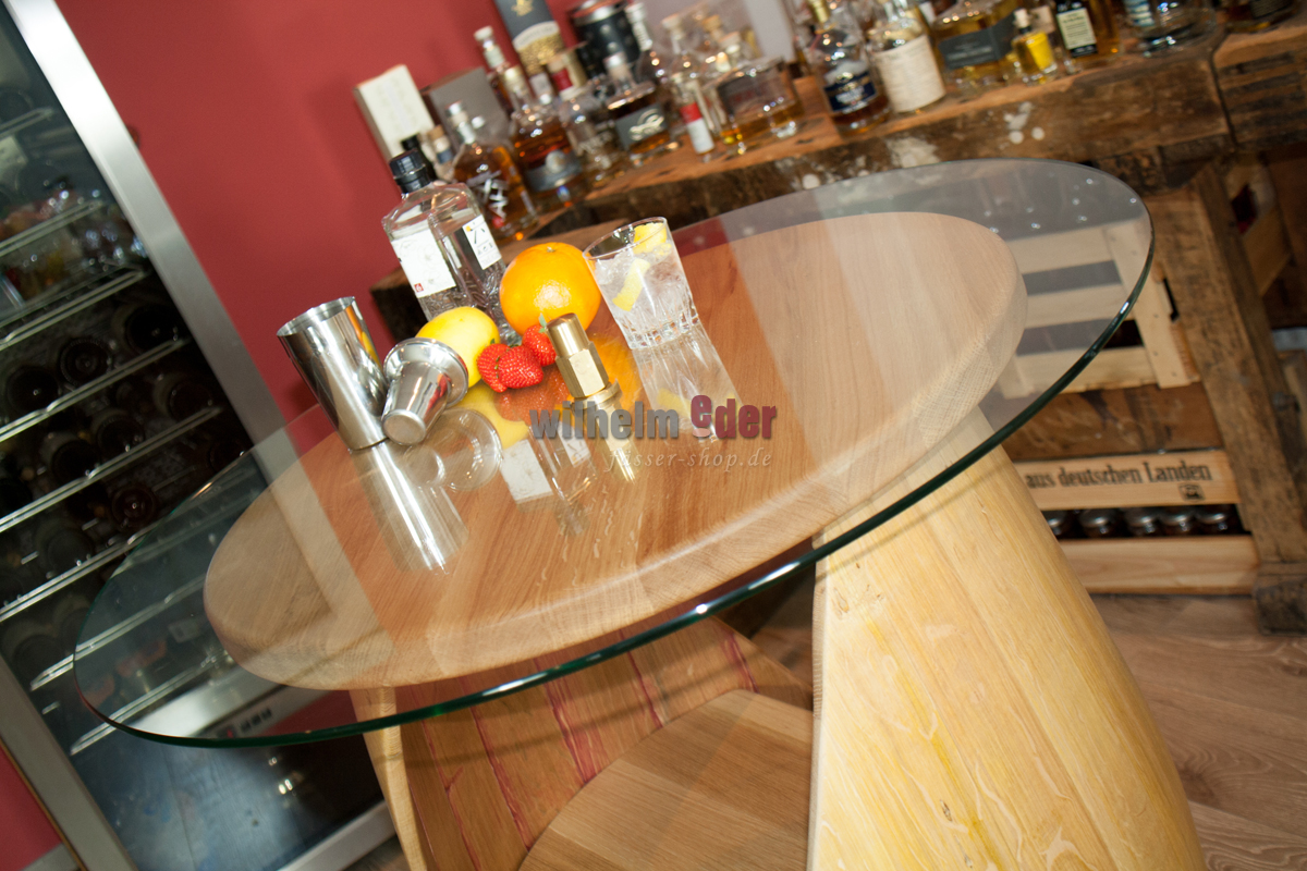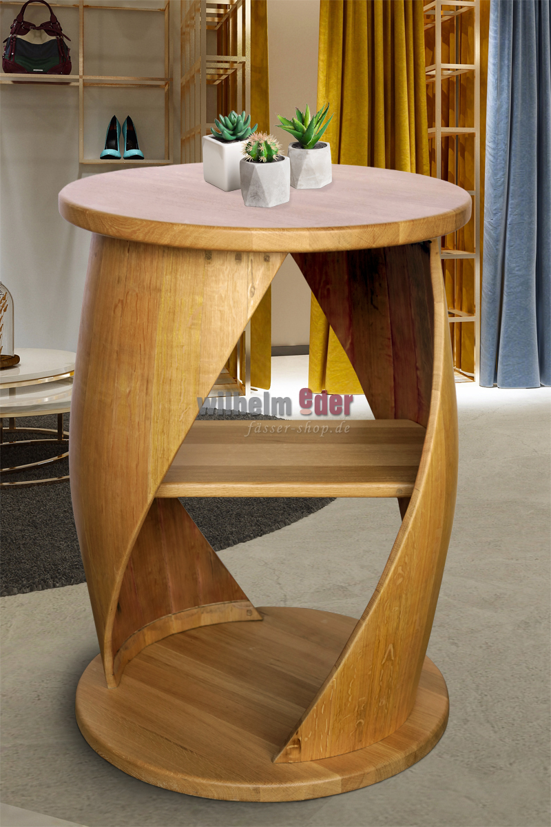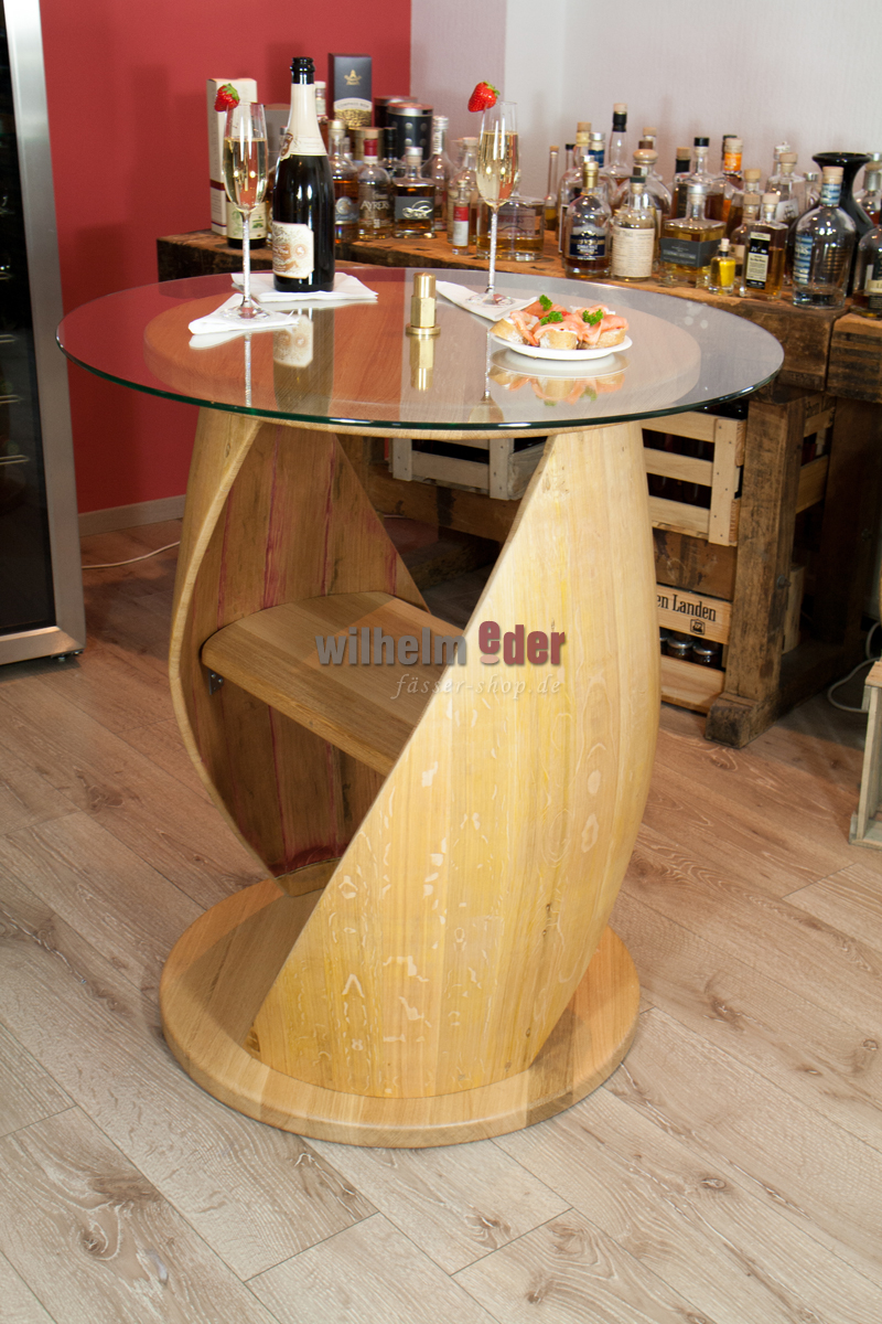Exklusives Regalfass, hergestellt aus einem gebrauchtem 225 l Weinfass, welches in aufwendiger Handwerksarbeit in dieses tolle Möbelstück verwandelt wurde. Das Fass wurde professionell gereinigt, getrocknet, verleimt und fein verschliffen. Zwei seitliche gesägte Rundungen machen das Fass zum Blickfang Ihres Lieblingszimmers. Der mittig eingelegte Regalboden ist aus Massivholz. Verschiedene Ausführung:Natur: Oberfläche abgeschliffen und unbehandeltSchwarz: Oberfläche lackiert, Tischplatte rundum mit Sockel ausgestattet – ohne AufdruckLackiert: Oberfläche farblos lackiert Die Glasplatte ist nicht im Preis enthalten und kann bei Zubehör optional bestellt werden. Vor der Herstellung von Regalen lassen wir die Fässer trocknen und verleimen die Dauben einzeln. Dieser aufwendige Prozess gewährleistet die Stabilität des Regals und verhindert, dass das Holz sich aufgrund Temperaturschwankungen verzieht. Bitte beachten Sie trotzdem, dass allzu trockene und warme Heizungsluft dem Fass nicht guttut.