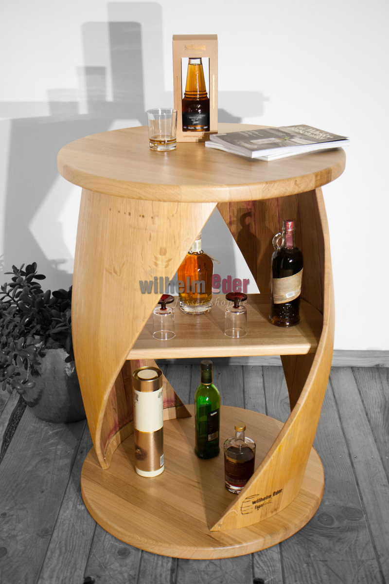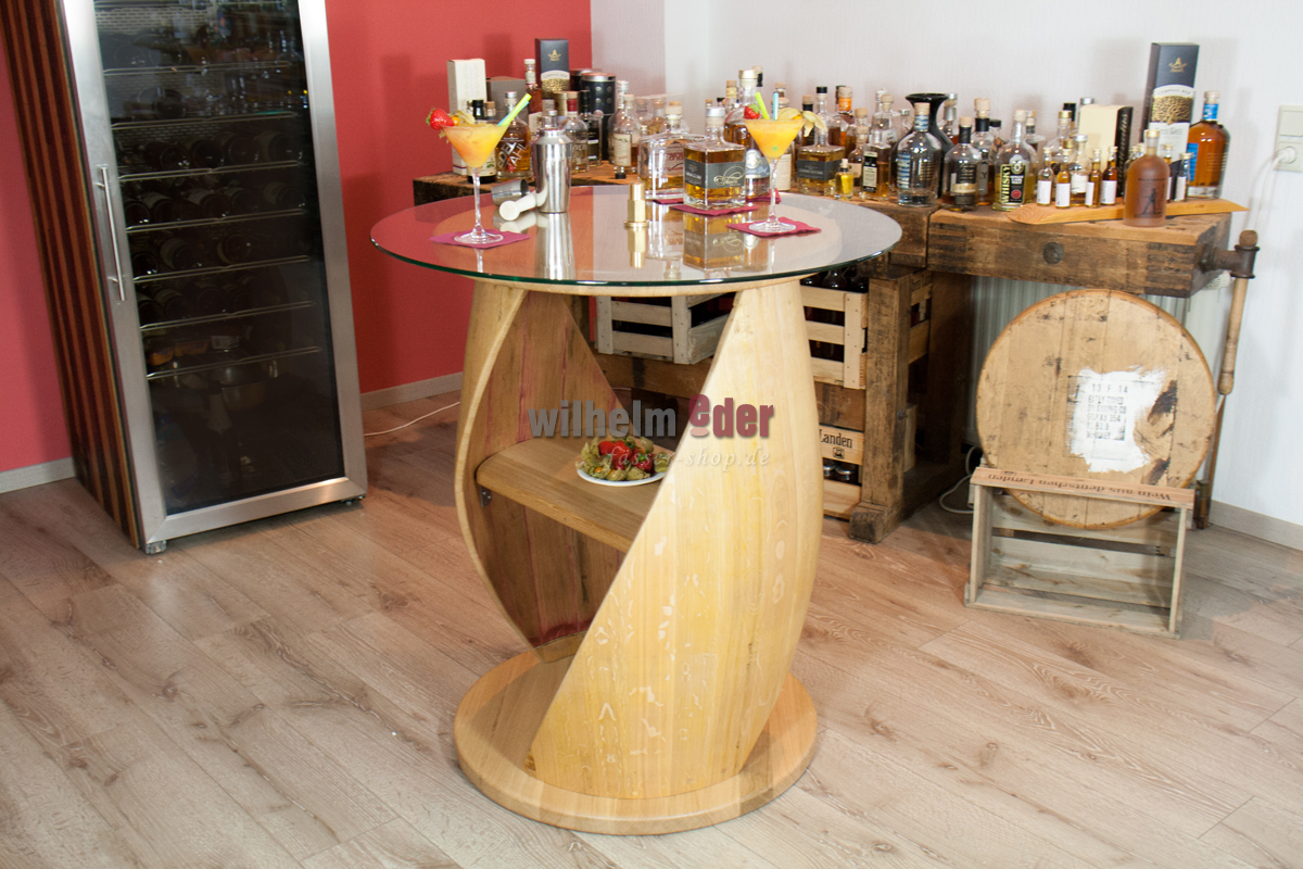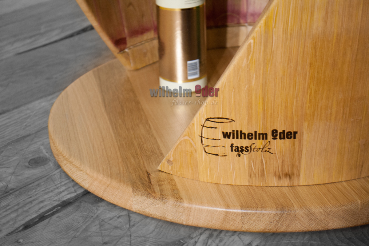 Regalfass aus einem gebrauchten 225 l Barriquefass, durch Meisterhand umgebaut als exklusives Weinlagerregal mit einem integrierten Barriquefassboden als Abstellfach für Gläser und Flaschen.Die feuerverzinkten Reifen sind gebürstet, anschließend wird das Fass mit hellem Klarlack überzogen. Wir legen bei diesem Produkt Wert auf größtmögliche Authentizität. Dies bedeutet, dass ein Regalfass/Tisch dieser Art zuvor jahrelang in den „Warehouses“ der unterschiedlichen Destillen gelegen hat und bewegt wurde. Kerben im Holz oder unter Umständen ein unebener Boden sind keine Qualitätsmängel sondern vielmehr durch die Eigenart der Bauweise und die Vorbenutzung der Fässer bestimmt. Vor der Herstellung von Regalen lassen wir die Fässer trocknen und verleimen die Dauben einzeln. Dieser aufwendige Prozess gewährleistet die Stabilität des Regals und verhindert, dass das Holz sich aufgrund Temperaturschwankungen verzieht. Bitte beachten Sie trotzdem, dass allzu trockene und warme Heizungsluft dem Fass nicht guttut.