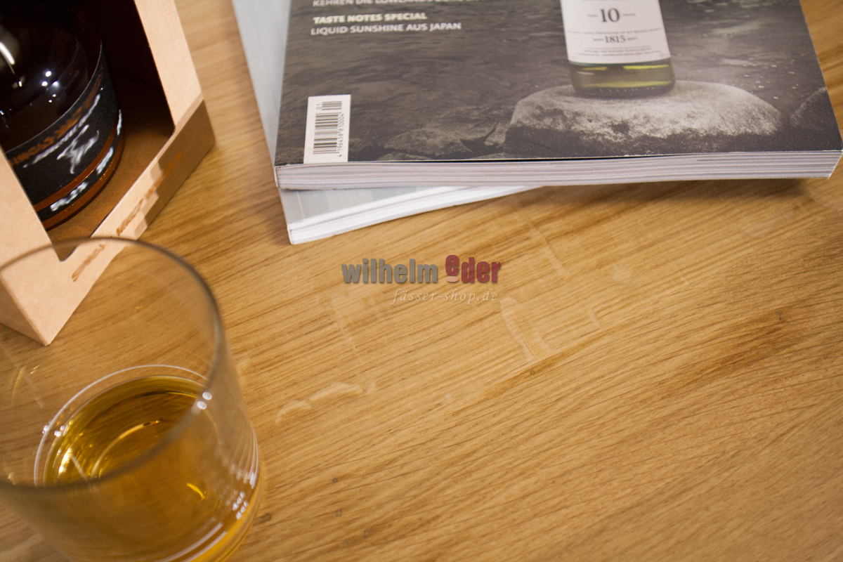 Das Fass ist getrocknet, gesäubert und geschliffen. Jede einzelne Daube wird verleimt und die gebürsteten Reifen sind mit Schrauben fixiert. Durch eine Oberflächenbehandlung mit Leinöl entsteht eine exklusive Optik. Die zweiflüglige Tür öffnet nach außen. Innen ist das Fass unbehandelt und zeigt eine Rotweinfärbung. Zwei drehbare Regalböden sind das Highlight in dem Fass. Für die richtige Beleuchtung sorgt das eingebaute LED-Band. Für die ideale Stehtischhöhe sorgen drei Füße in Dauben-Optik. Eine Tischplatte, wie zum Beispiel eine Glasplatte, ist unter Zubehör bestellbar. Eichenholz, mit Leinöl behandelt – kann auch in natur, rustikal gebeizt oder mit Klarlack überzogen bestellt werden. Alle Bilder sind Beispielbilder und optische Abweichungen sind möglich. Wir legen bei diesem Produkt Wert auf größtmögliche Authentizität. Dies bedeutet, dass ein Regalfass/Tisch dieser Art zuvor jahrelang in den „Warehouses“ der unterschiedlichen Destillen gelegen hat und bewegt wurde. Kerben im Holz oder unter Umständen ein unebener Boden sind keine Qualitätsmängel sondern vielmehr durch die Eigenart der Bauweise und die Vorbenutzung der Fässer bestimmt. Vor der Herstellung von Regalen lassen wir die Fässer trocknen und verleimen die Dauben einzeln. Dieser aufwendige Prozess gewährleistet die Stabilität des Regals und verhindert, dass das Holz sich aufgrund Temperaturschwankungen verzieht. Bitte beachten Sie trotzdem, dass allzu trockene und warme Heizungsluft dem Fass nicht guttut.
