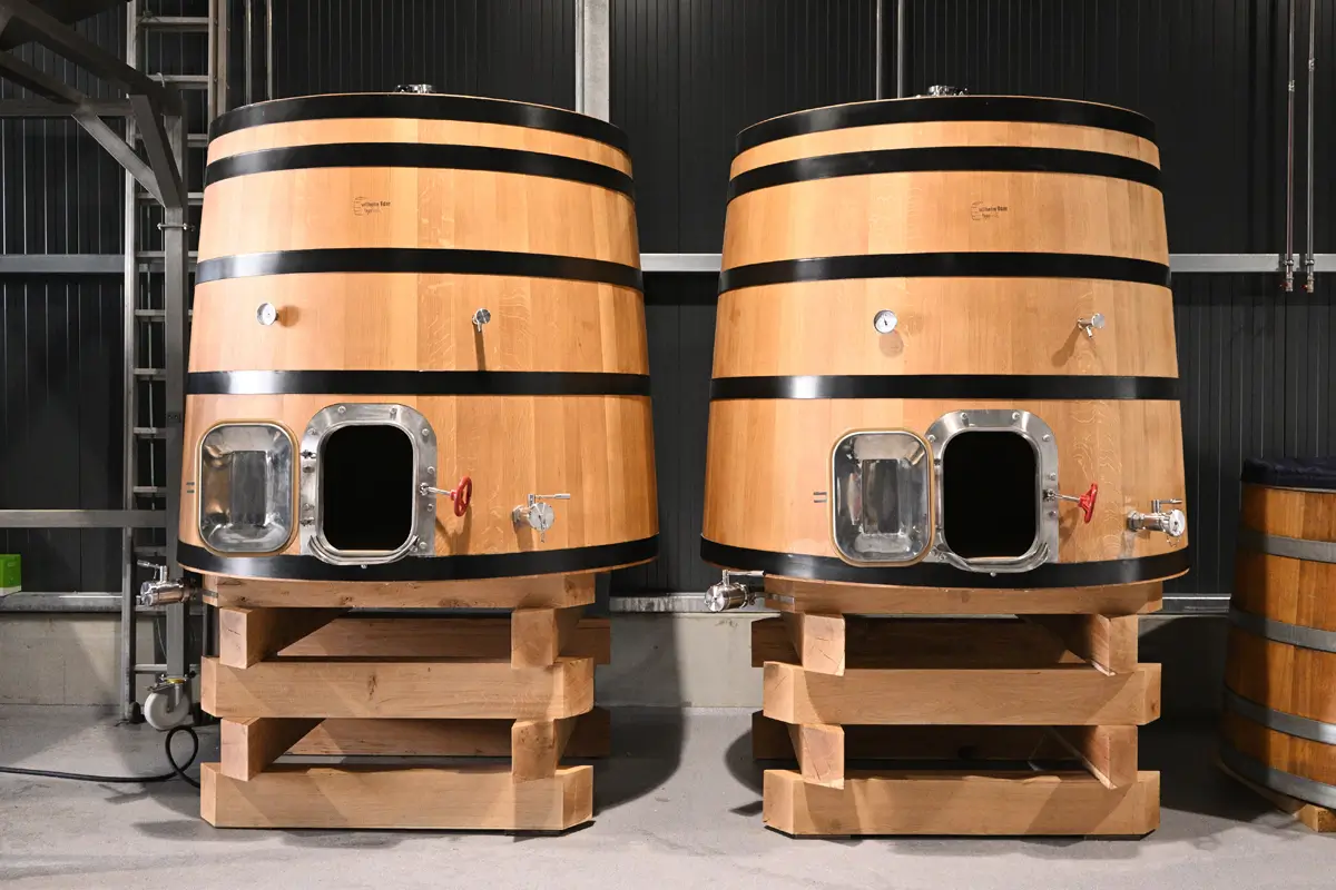 Gärbottiche produziert im Kundenauftrag, hergestellt aus abgelagertem Eichenholz, Herkunft Pfälzer Wald / Nordvogesen. Feinjährig auf Buntsandstein ca. 200 Jahre gewachsen, nachhaltig eingeschlagen.