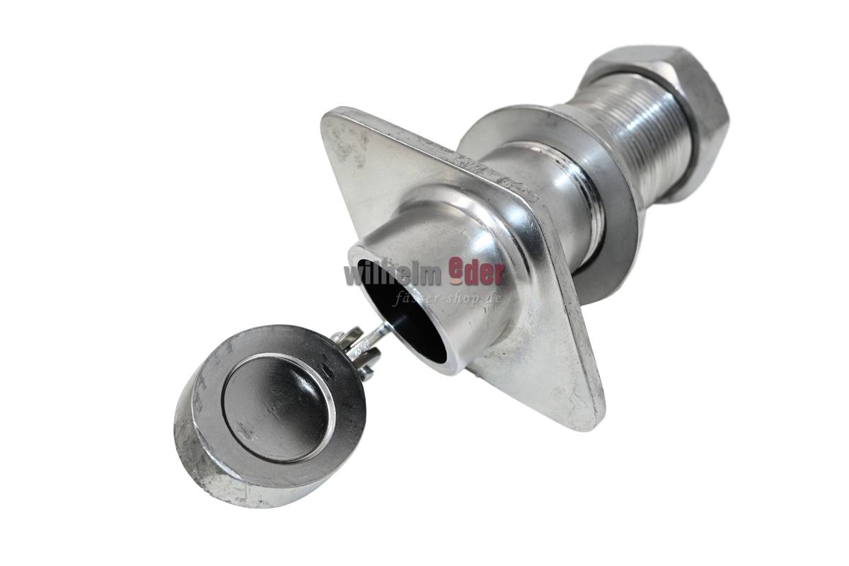 Die Zapflochklappe aus Edelstahl (V4A) wird fertig in die Tür vom Fass eingebaut. Die Klappe liegt im Fass und ist dicht. Erst durch einführen eines Rohres kann man das Fass entleeren.