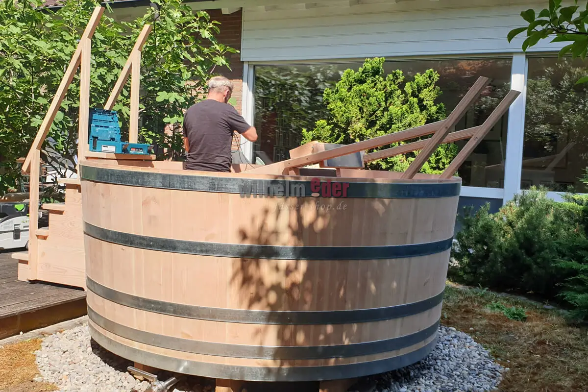 Der Bottich steht; aber wer jetzt denkt, dass wir fertig sind, hat falsch gedacht. Unser Kunde hat sich einiges an Zubehör gewünscht. Es wird ein Ablaufrohr mit Ventil am Boden des Bottichs installiert sowie ein Wasserkreislauf mit Pumpe und einem kleinen Wasserfall. Für die Gemütlichkeit darf eine Bank im Badefass nicht fehlen und eine Treppe als Ein- und Ausstieg wurde auch maßgefertigt.