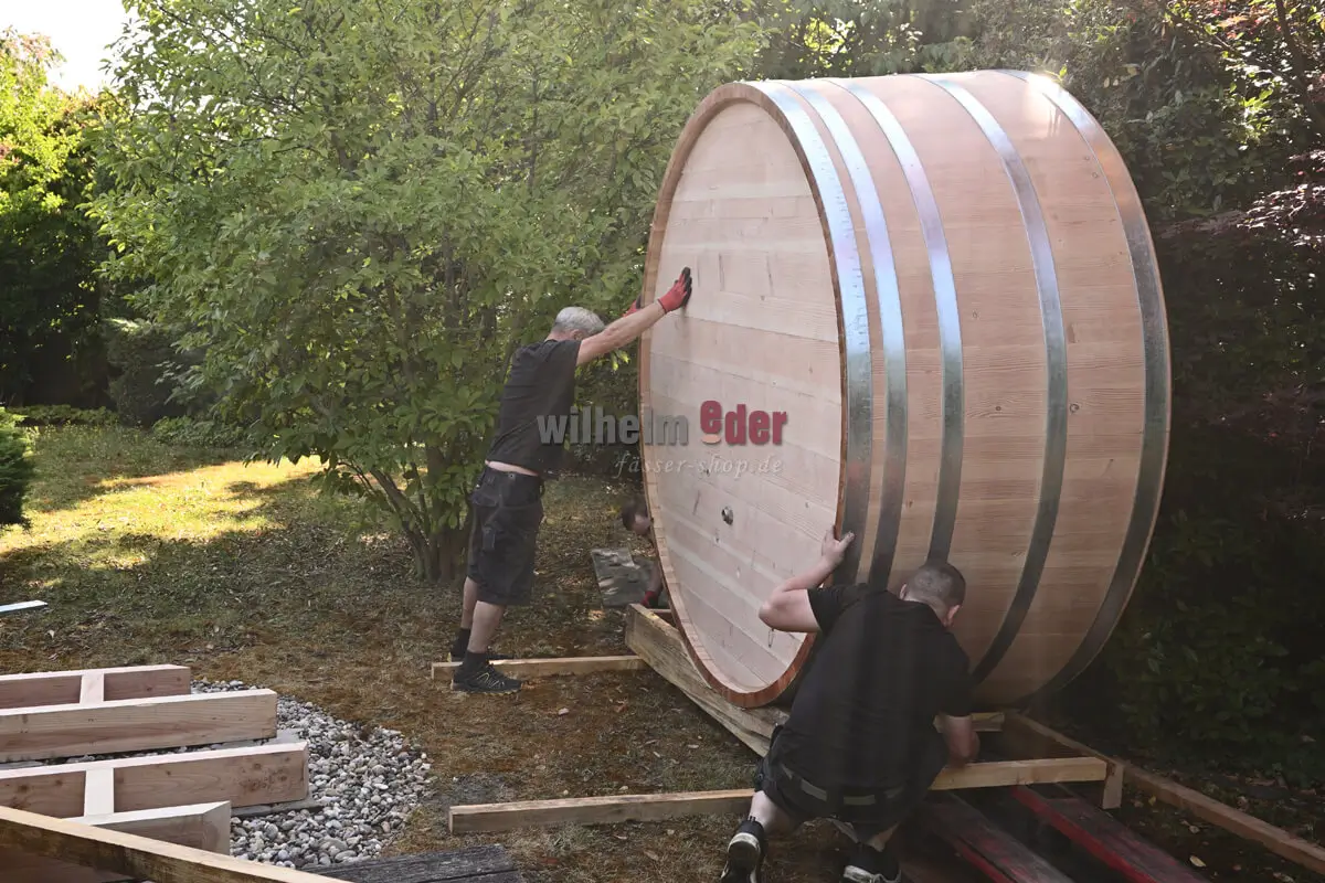 Die Planung der Auslieferung ist ein eigenes Kapitel für sich! Das passiert gerne parallel zum Bau des neuen Fasspools. Die örtlichen Gegebenheiten sind wichtig für den Bau und die Auslieferung des Badebottichs – wenn möglich sehen wir uns die Gegebenheiten vorab einmal an. Die Frage ist oft, ob man mit einem normalen Hubwagen in den Garten gelangt oder ob wir aufgrund der Größe und Schwere des Bottichs größere Gerätschaften einsetzen müssen. Auch der Zugang zum Garten spielt eine Rolle. Ist der Weg breit genug, zugewachsen oder nicht, wäre der Kunde bereit ein paar Äste zu “opfern” oder müssen andere Wege her? Manchmal wird auch ein kleines Transportgerüst für den Holzpool gebaut. Einer der kleinen Kniffe damit der Bottich heil ankommt.