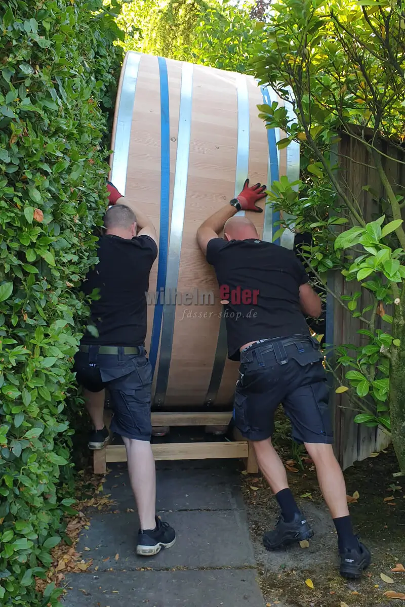 Schwierigkeitsstuffe 100/100 – Die Aufgabe: Der Transport des Badebottichs vom LKW zum Ort im Garten wo der Badezuber aufgestellt werden soll. Wenn das Abladen schon nicht einfach war, so kommt jetzt die Königsdisziplin! Wenn ich ehrlich bin, hatte ich doch etwas meine Zweifel, ob der Holzbottich so durch den Weg im Gartenpasst, wie es sich meine Kollegen vorstellen und wie sie es geplant haben. Aber was eine:r gute:r Handwerker:in ist weiß sich immer zu behelfen und die Erfahrung macht es auch. Mit viel Kommunikation und “Weiter”, “Halt”, “Rechts, “Schieb” und vielem mehr haben meine Kollegen den Badebottich zu seinem Platz bugsiert. Nach Absprache mit dem Kunden musste aber trotzdem der ein oder andere Ast fallen oder ein Stein vorübergehend zur Seite gestellt werden.