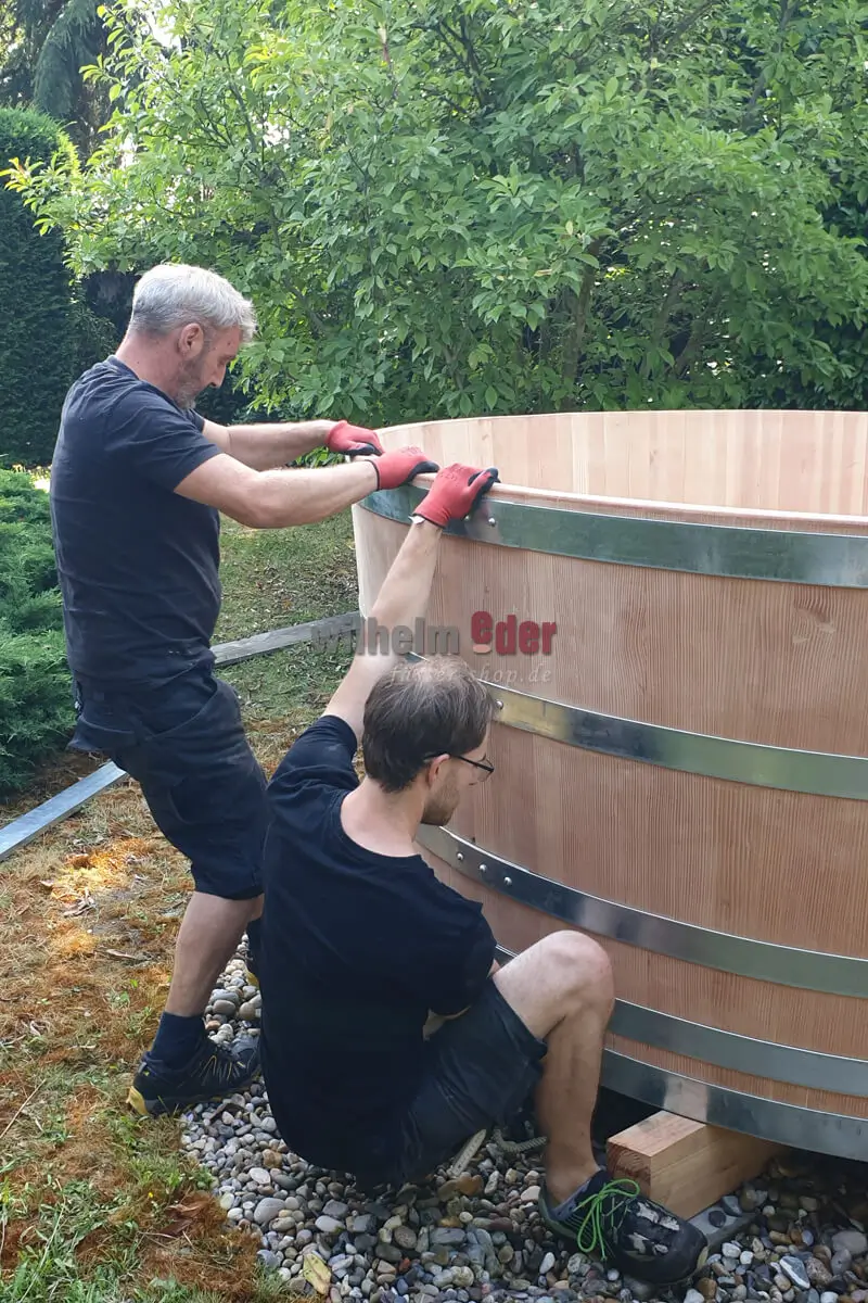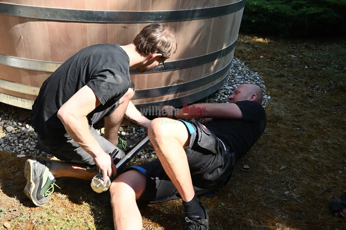Das Abenteuer geht weiter. Jetzt ist der Augenblick gekommen das Badefass aufzustellen. Nochmals wird die Position des Bottichs und der Lagerbalken kontrolliert. Lieber zweimal gecheckt als einmal falsch geschaut. Sobald alles an Ort und Stelle ist versteht man noch mehr, warum jede helfende Hand bei diesen Aufträgen so wichtig ist! Meine Kollegen mussten mit Köpfchen und Muskelkraft den Badebottich herumheben und auf den Lagerbalken ausrichten. Bis zum letzten Moment für mich definitiv ein äußerst spannender Augenblick. Ich vermute für unseren Kunden an dem Tag ebenso.