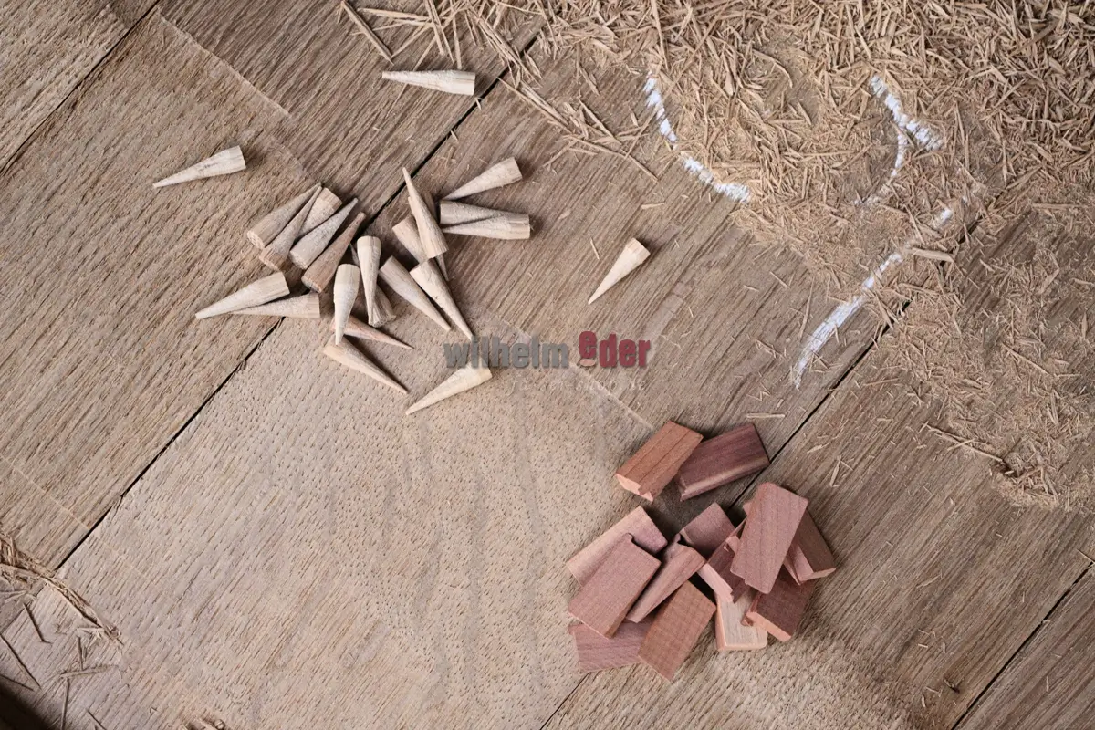 Ein Reparatur-Set bestehend aus 8 Kegeln und 8 Splinten aus Eichenholz, zur Reparatur von kleinen Leckagen und Undichtigkeiten an Holzfässern.