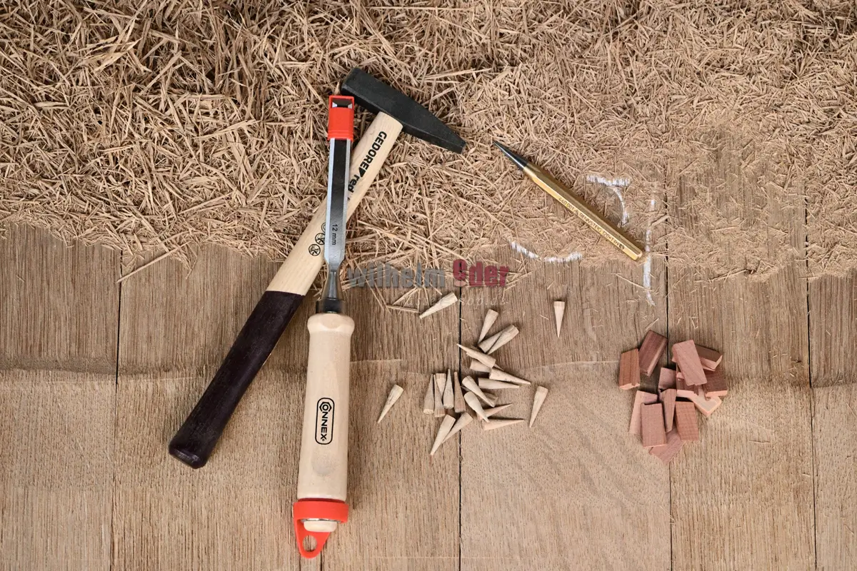 Werkzeugset, bestehend aus einem kleinen Hammer, einem Stechbeitel und einem Durchtreiber, zur Reparatur kleiner Leckagen im Holzfass. Ergänzend können Sie das Reparatur-Set-Holzsplinte erwerben.